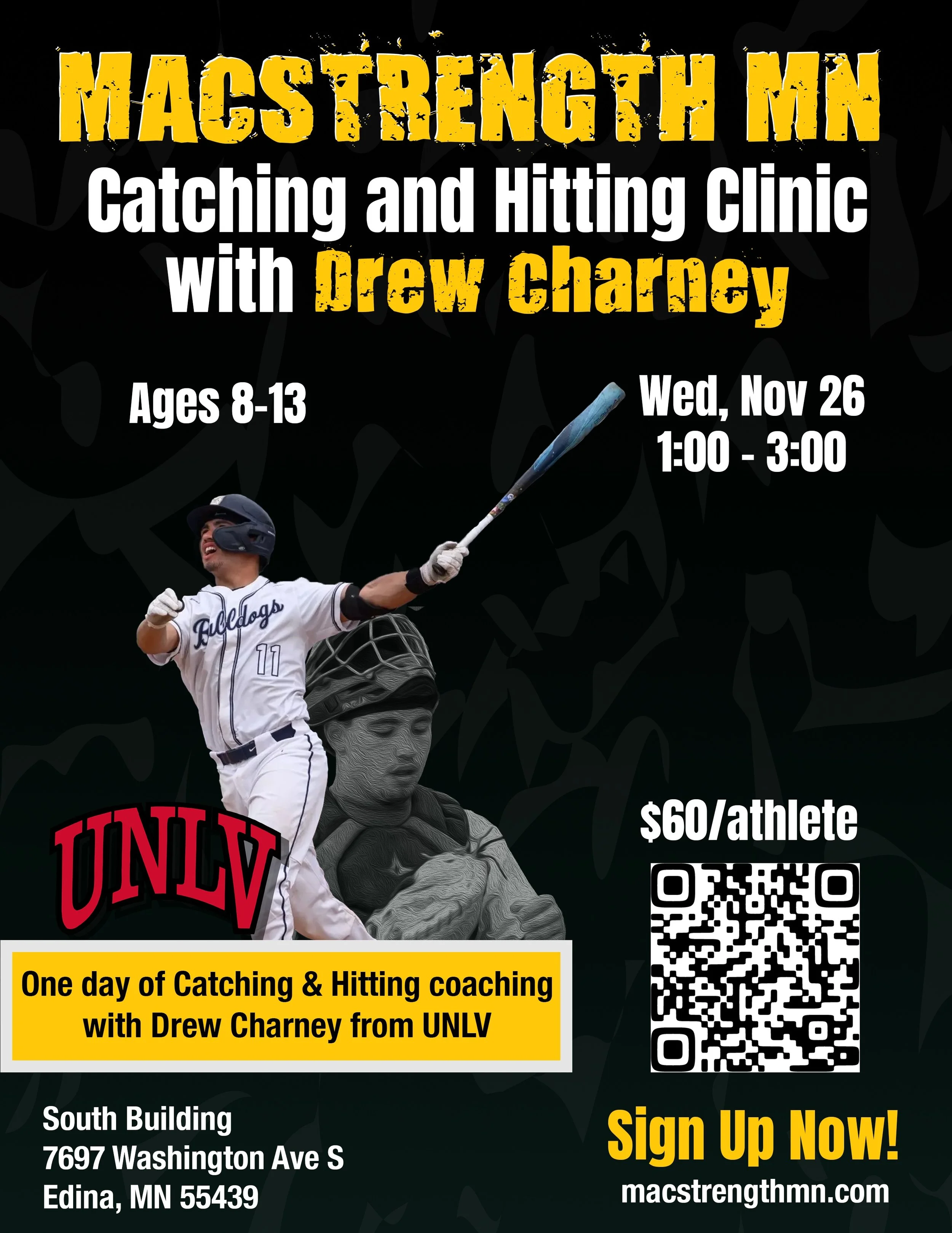 Drew Charney from UNLV will be running 8-13u players through a catching and hitting camp from 1:00 - 3:00. Drew is a Hopkins alumni who’s trained at Macstrength since he was in high school.